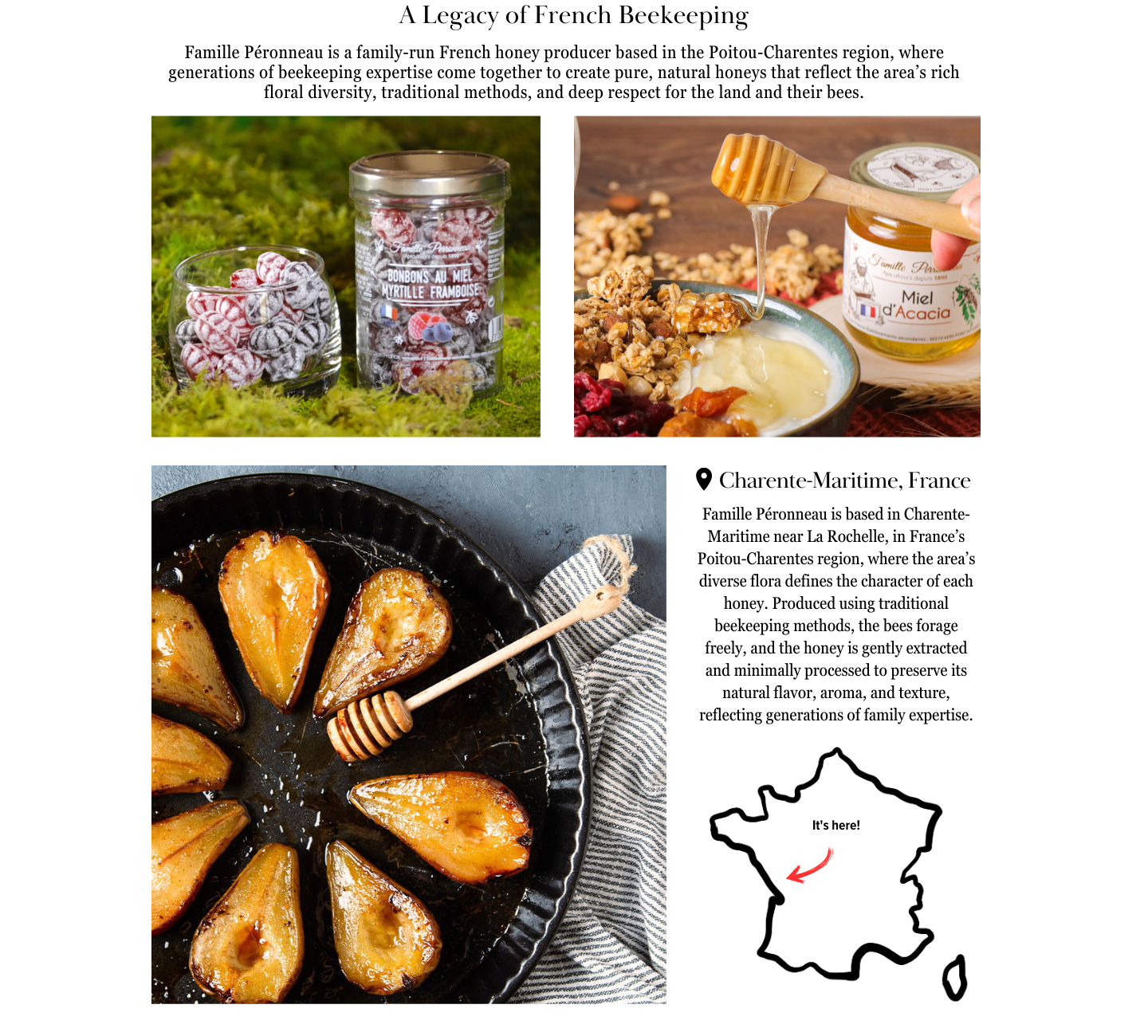 For over 120 years the Perronneau family has cultivated a passion for beekeeping and honey. The company has been family owned and operated since 1890. Now in their 5th generation, the Perronneau family transports their hives all over France, allowing them access to different species of flowers and trees, resulting in a wide range of monofloral and polyfloral honey varieties. Each honey has unique characteristics, from color to consistency to taste and aroma, much like the variation in fine wines. With so many varieties, there is a flavor to suit almost any palate.