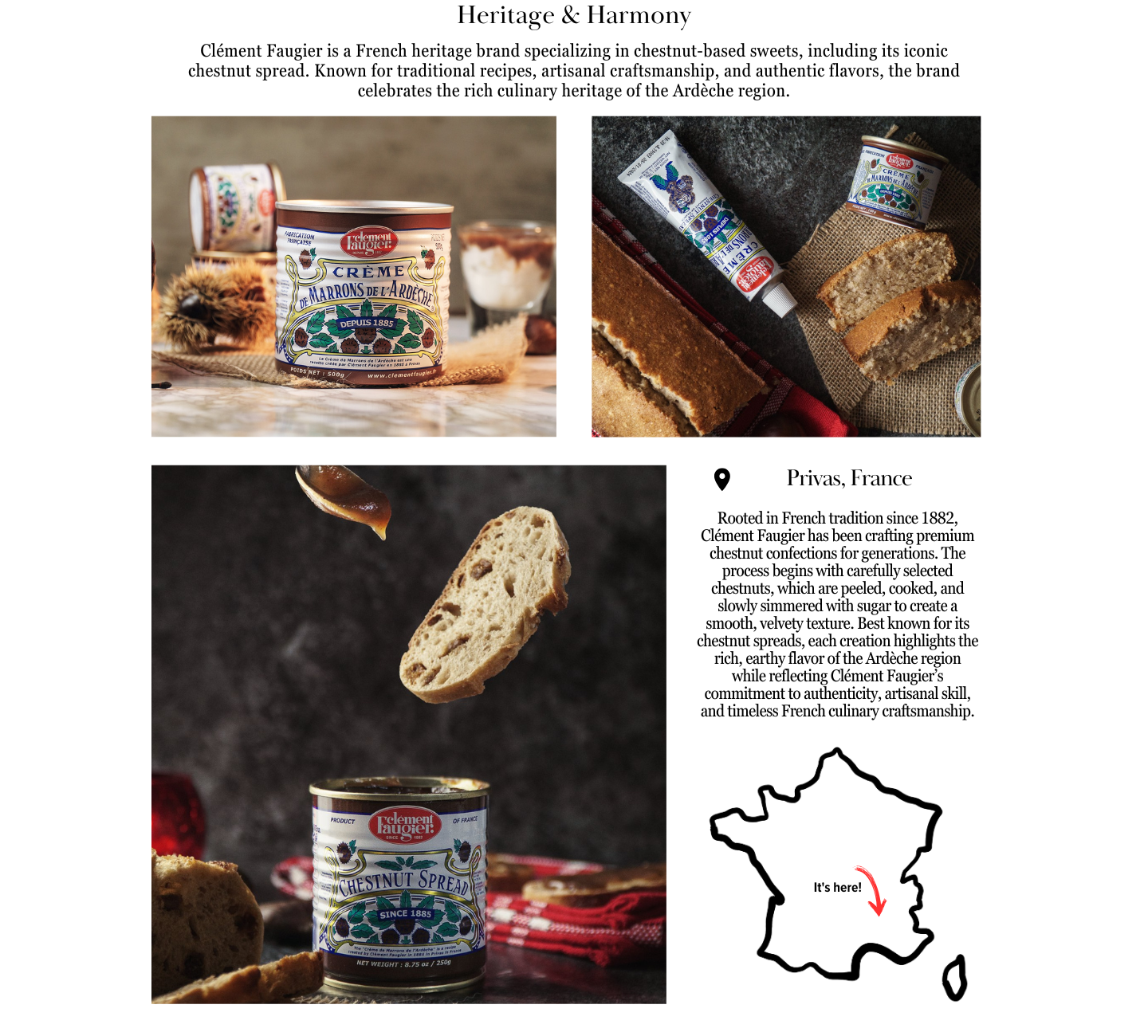 The Clement Faugier brand has a long and interesting history that goes back more than 100 years. In 1882, an abundance of chestnut production in the Privas region inspired Clement Faugier to launch an ice chestnut factory that would manufacture a variety of chestnut-based delicacies.